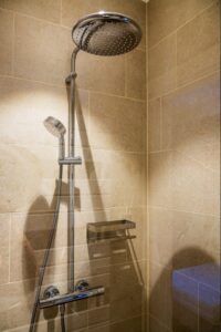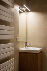 *Bad Grundausstattung mit Regendusche, Handtuchheizkörper, Handtücher, Duschvorleger, Haarföhn