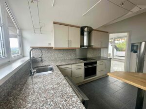Begleiten Sie uns auf einem kleinen Rundgang: Vom praktischen Parkplatz bzw. der Garage geht es direkt zum Hauseingang. Über das freundliche Stiegenhaus (ohne Lift) betritt man im 2. Obergeschoß die schöne Wohnung mit eigener Innenstiege, die direkt in den ca. 45qm großen Wohnraum (großteils Raumhöhe ca. 3,50m) mit vorgelagerter Süd-Terrasse und einem kleinen West-Balkon führt. Hier lässt es sich leben. In den Sommermonaten genießt man von morgens bis abends die schöne Terrasse (mit Markise), ein Glas Wein schmeckt in der Abendsonne am Westbalkon besonders gut. In den kühleren Monaten chillt man vor dem offenen RUEGG-Kamin. Ein großer Esstisch findet vor der Terrasse Platz – für Familie und Gäste lassen sich herrliche Menüs in der perfekt ausgestatteten Küche vorbereiten, die sich unmittelbar neben dem Essplatz befindet. Granit-Arbeitsplatten, ein Designer-Dunstabzug, Miele-Geräte (Geschirrspüler, Kühlschrank, E-Herd und Backofen, Mikrowelle, Waschmaschine) und eine kleine Essbar sorgen für angenehmes Arbeiten. Und in der Speis lassen sich Vorräte gut verstauen. Etwas links vom Stiegenaufgang befindet sich die praktische Garderobe und das Gäste-WC. Links der Treppe eröffnet sich der mit einer Tür abgeschlossene Schlafbereich: Zwei nach Osten ausgerichtete Schlafzimmer mit Ausgang auf den gemeinsamen Balkon sorgen für gute Morgenstimmung sowie das großzügige Bad mit Wanne und Dusche, Beide Schlafzimmer sind mit wunderschönen maßgefertigten Einbaukästen ausgestattet – das größere Schlafzimmer verfügt auch über einen begehbaren Schrankraum und das kleinere über einen praktischen Abstellraum. Auch auf der Terrasse findet man Platz für Gartenmöbel und Gartengeräte in zwei weiteren Abstellräumen. Ergänzt wird diese schöne Wohnung durch ein großes Kellerabteil mit ca. 7,24qm und durch den praktischen PKW-Stellplatz. Der Wohnung zugehörig ist auch eine Garage mit elektrischem Tor zum Preis von € 25.000, – , welcher imKaufpreis nicht enthalten ist. Optional ist es möglich eine zweite Garage käuflich zu erwerben.