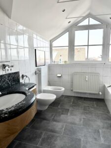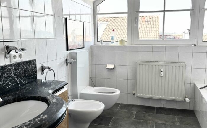 – Badezimmer mit Wanne, Dusche, Bidet und Fenster