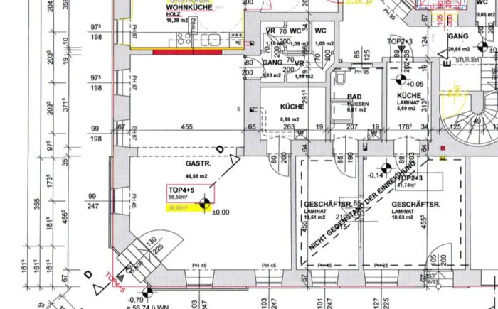 … und nahe der Thaliastraße befinden sich am Eck eines gepflegten, sympathischen Zinshauses in der Begegnungszone Hasnerstraße Räumlichkeiten im Erdgeschoß, die sich perfekt für ein viele Zwecke eignen: Büro, Werkstatt, Geschäftslokal uvm. Über das gut einsichtige Portal erreicht man einen großen Raum mit 46,58qm – drezeit in 2 Räume geteilt – an den direkt eine Teeküche anschließt. Ein kleiner Abstellraum, zwei Toiletten und ein Keller ergänzen das Raumangebot. Die Räume sind mit Laminat-Böden ausgestattet – mit einem kleinen Face-Lifting (nach Absprache mit der Eigentümerin bezüglich finanzieller Beteiligung) entsteht hier eine kleine, feine, praktisch und ruhig gelegene working-base für viele neue Ideen