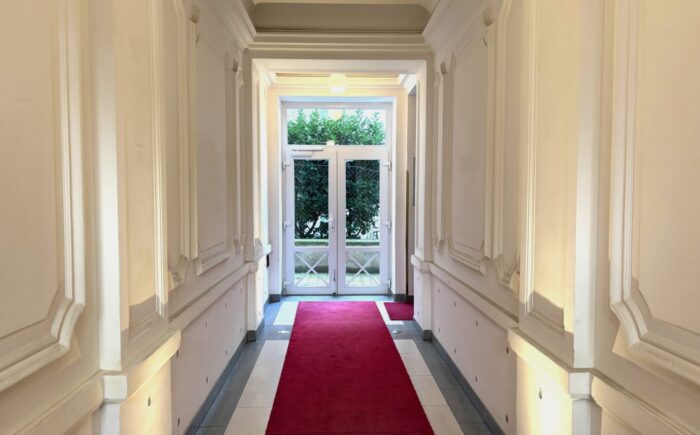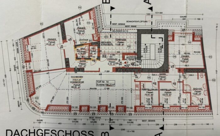 Über den Lift bis zum 3. OG und über eine Treppe in das DG erreicht man den Wohnungseingang mit geräumigem Vorzimmer und Garderobe. Hier geht es zur rechten gleich auf die schöne Sonnenterrasse, wo man herrlich Frühstücken, Mittagessen oder abends ein Glas Wein genießen kann. Zur linken betritt man das große Wohn/Esszimmer (ca. 66,50qm) mit Platz für eine offene Küche mit Insel (alle Anschlüsse sind vorhanden) und den einladenden Esstisch – im Erkerbereich lässt es sich herrlich relaxen. Zur linken des Wohnbereiches erreicht man den „Elternbereich“ – ein größeres und ein kleineres Zimmer, ein schönes Bad mit Wanne, Dusche, Doppelwaschbecken, WC und Fenster sowie einen praktischen Wirtschaftsraum mit Waschmaschinen-Anschluss. Von der Garderobe geht es direkt in einen weiteren Privatbereich der Wohnung mit 3 Zimmern, einem kleinen Duschbad, Gäste-WC.