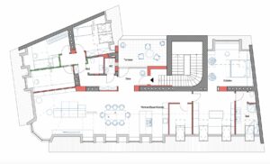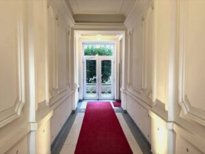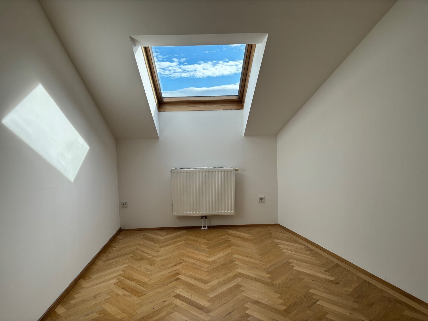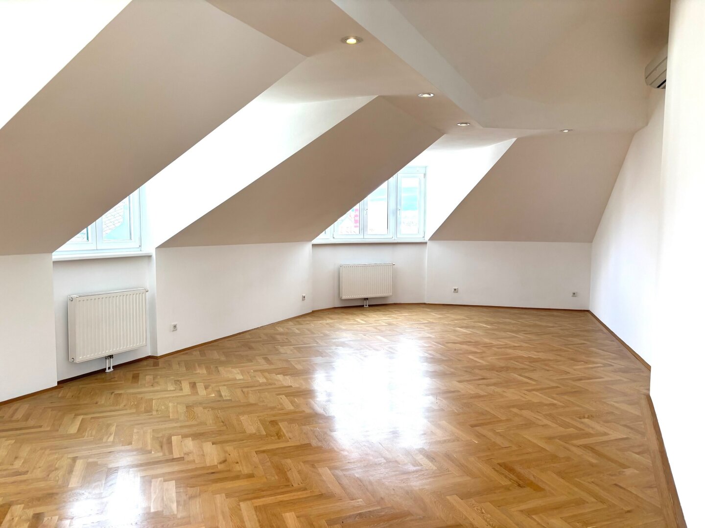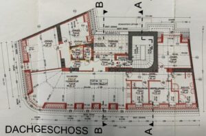 Über den Lift bis zum 3. OG und über eine Treppe in das DG erreicht man den Wohnungseingang mit geräumigem Vorzimmer und Garderobe. Hier geht es zur rechten gleich auf die schöne Sonnenterrasse, wo man herrlich Frühstücken, Mittagessen oder abends ein Glas Wein genießen kann. Zur linken betritt man das große Wohn/Esszimmer (ca. 66,50qm) mit Platz für eine offene Küche mit Insel (alle Anschlüsse sind vorhanden) und den einladenden Esstisch – im Erkerbereich lässt es sich herrlich relaxen. Zur linken des Wohnbereiches erreicht man den „Elternbereich“ – ein größeres und ein kleineres Zimmer, ein schönes Bad mit Wanne, Dusche, Doppelwaschbecken, WC und Fenster sowie einen praktischen Wirtschaftsraum mit Waschmaschinen-Anschluss. Von der Garderobe geht es direkt in einen weiteren Privatbereich der Wohnung mit 3 Zimmern, einem kleinen Duschbad, Gäste-WC.