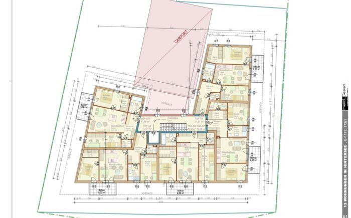Obergeschoss: Fünf 3-Zimmer-Wohnungen mit Balkon (Wohnfläche ca. 72,50 m²) + ( Balkon ca. 9 m² ) – jeweils € 294.000,00