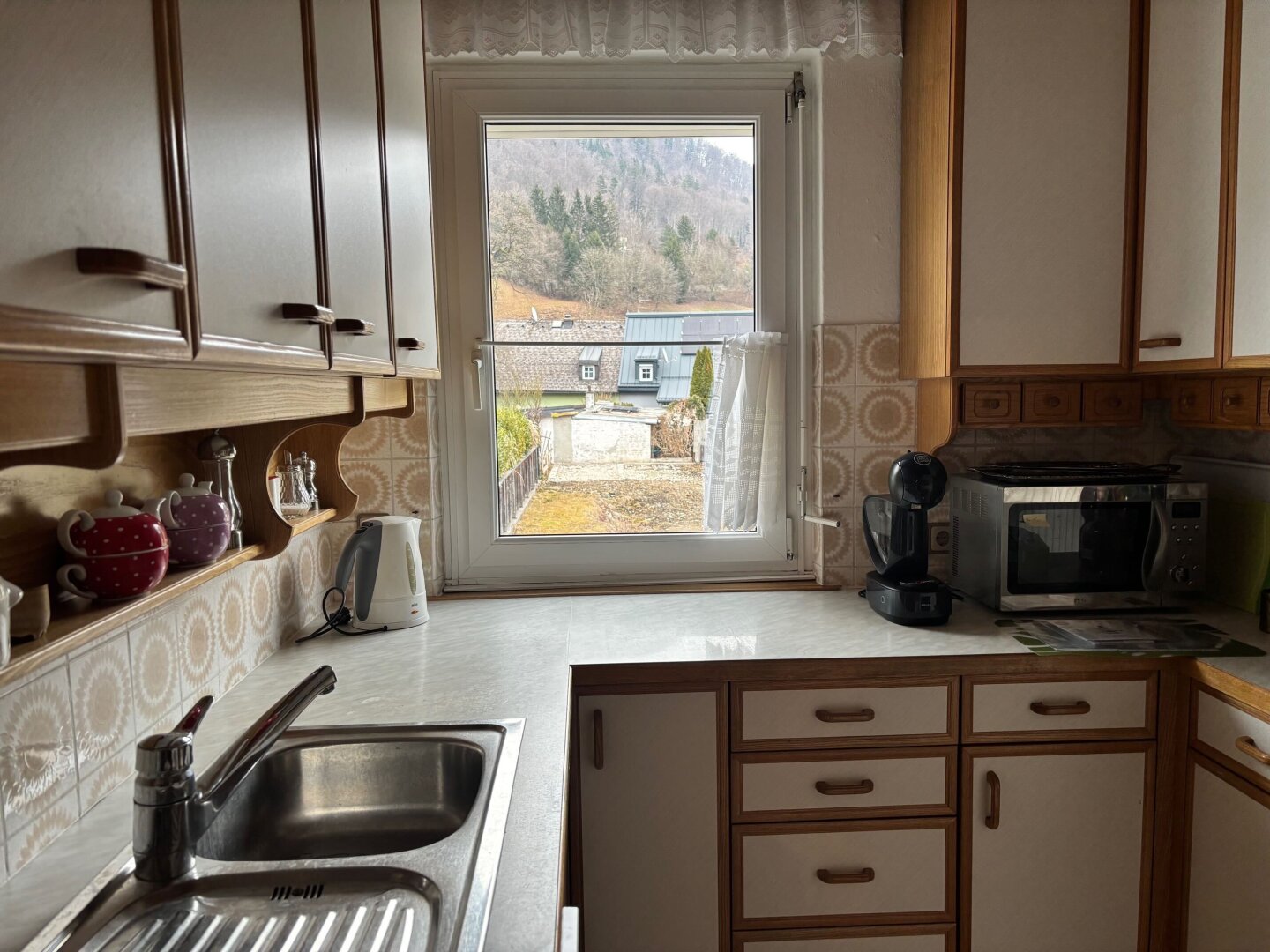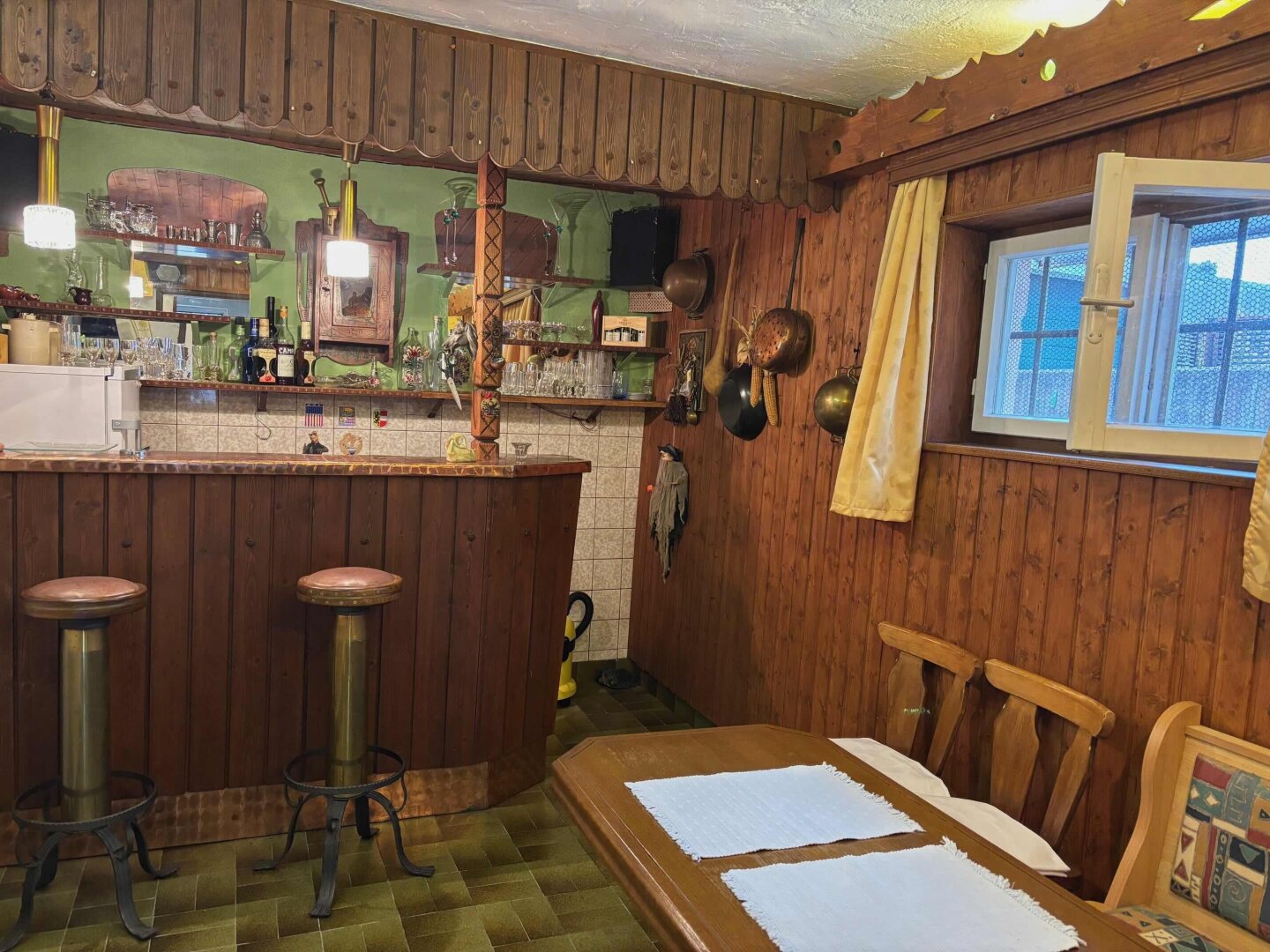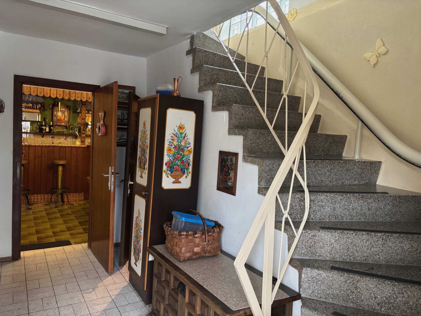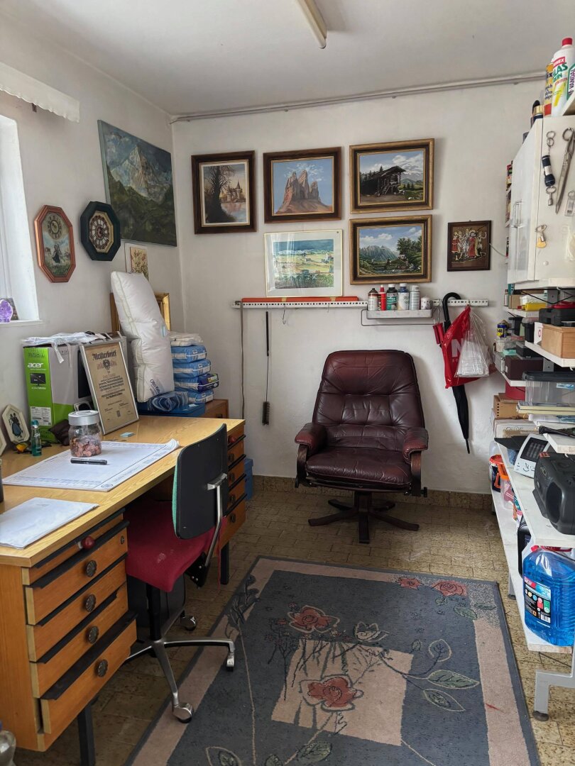 Das 1963 errichtete und regelmäßig gepflegte Einfamilienhaus mit Wohnbereich im Obergeschoß und Arbeitsbereich im Untergeschoß erfüllt diese Träume seit Jahren. Im Erdgeschoß befindet sich eine große Werkstatt, ein Büro, weitere Nebenräume sowie zwei Garagen. Vor dem Haus ist Platz für mehrere PKW`s. Vom Hauseingang betritt man den Vorraum mit praktischem Abstellraum und einem Kellerstüberl im Original Vintage-Stil – ein Highlight des Hauses. Über die Platz sparende Treppe geht es in den Wohnbereich. Hier genießt man vom Esszimmer mit angeschlossener Küche einen wunderbaren Gaisbergblick. Beim Frühstück in der Morgensonne sammelt man Energie für einen anstrengenden Tag. Gegenüber befindet sich das gemütliche Wohnzimmer mit vorgelagerter, traumhafter Sonnenterrasse mit wunderbarem Untersbergblick und Sonne von mittags bis abends. Drei weitere Zimmer, ein Vorraum, ein Duschbad und ein WC ergänzen das Raumangebot dieser Etage.