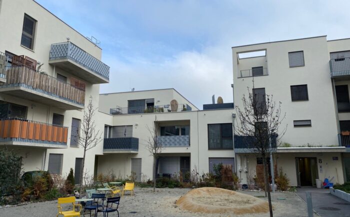 In den Innenhöfen befinden sich Grünflächen und Spielplätze. Zur Wohnung kann ein TG-PLatz dazu gemietet werden.
