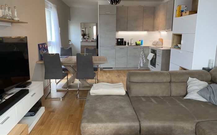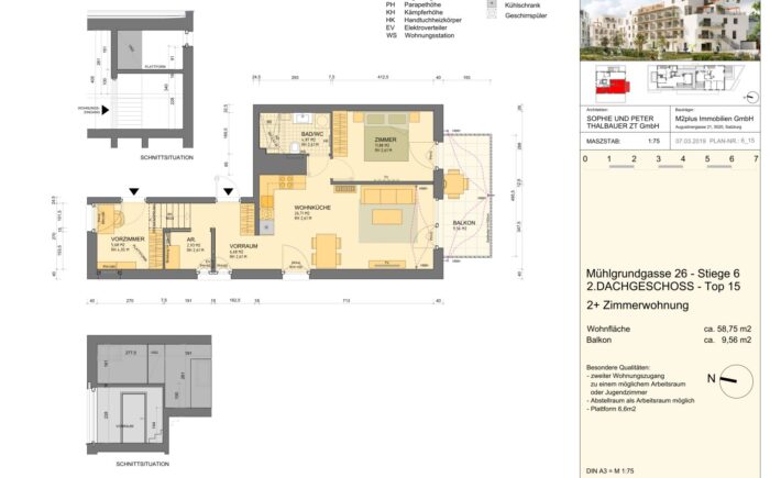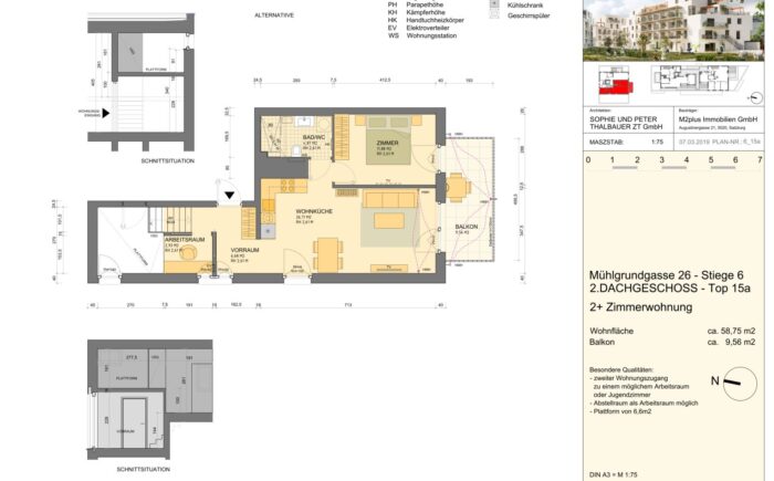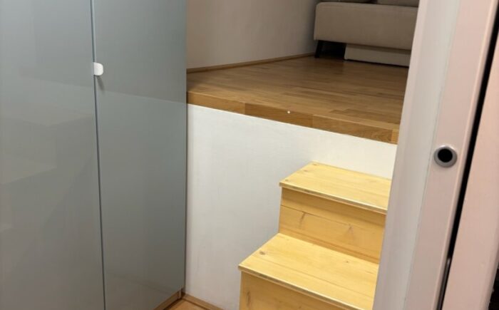 Die wunderbar helle, gemütliche Wohnung und die perfekte Nahversorgung in der Umgebung sind Pluspunkte, die herrliche Lebens- und Wohnqualität garantieren. Über das Stiegenhaus oder über den Lift erreicht man die mit 2 Eingängen ausgestattete Wohnung – diese erlauben zB. Wohnen & Arbeiten. Der Haupteingang führt in das geräumige Vorzimmer, zur linken geht es in die perfekt ausgestattete große Wohnküche mit Ausgang auf die Sonnen-Terrasse, von welcher sich ein traumhafter Ausblick bietet. Neben dem Wohnraum befindet sich das schöne Bad mit großer Dusche und Waschmaschinen-Anschluss und das gemütliche Schlafzimmer – ebenso mit Ausgang auf die Terrasse. Über einen 2. Wohnungseingang im unteren Geschoß erreicht man einen kleinen Raum (ca. 6qm) mit einer kleinen Platform (ca. 3qm), die sich als Büro/Gästezimmer eignet und über eine kleine Treppe verbunden ist. Ein weiterer wichtiger Pluspunkt ist das Thema Heizen und Kühlen im Wohnquartier: Ökologisches und kostengünstiges Heizen ohne Heizkörper, zugleich kühlendes Temperieren im Sommer ohne stromfressende Klimaanlage.
