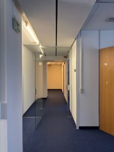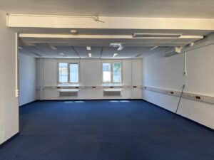 Teil II besteht aus einem teilbaren Großraumbüro sowie 4 weiteren Büroräumen und notwendigen Nebenräumlichkeiten wie Sanitärbereich, Lager, Serverraum, Teeküche – siehe Plan. Der großzügige Eingangsbereich wird von beiden Büromietern benutzt und kann individuell gestaltet werden.